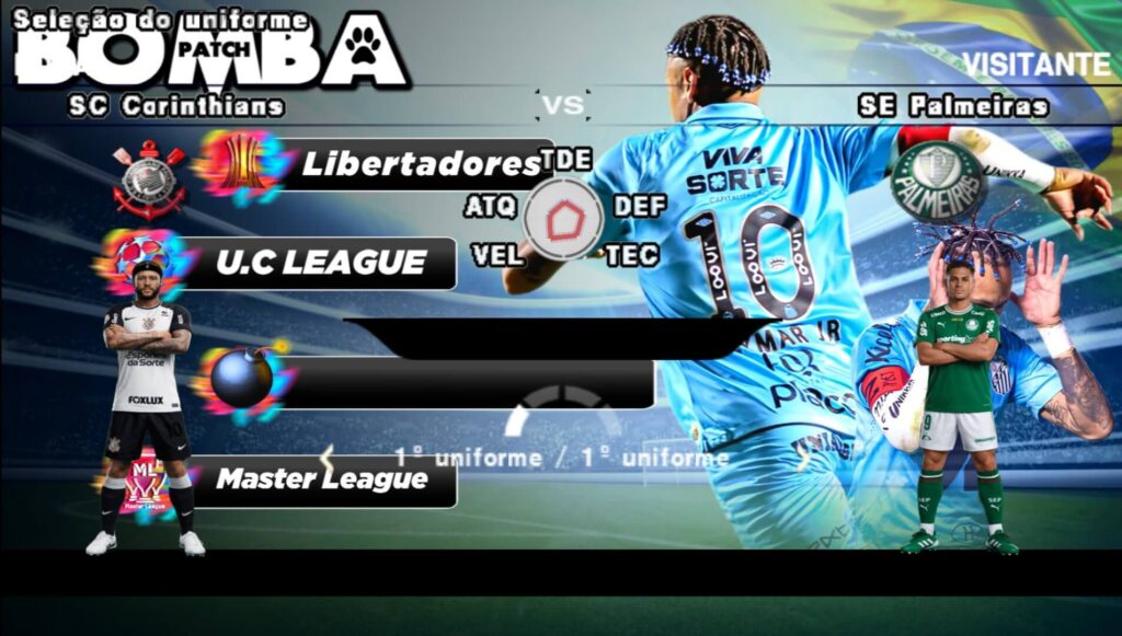 Já disse acima que a Master League é um dos melhores modos de jogo do Bomba Patch 2026 PPSSPP, e vou mostra o motivo. Na Master League você pode iniciar com um time do jogo, ou criar o seu do zero, no seu time você precisa primeiro ser um bom gestor, controlar as finanças, fazer contratações, renovar contratos e vender jogadores. Você também é o técnico, precisa arrumar seu time antes do jogo, fazer a formação do time e durante a partida boas substituições. Seu time compete a liga nacional, a copa nacional, e a copa do continente, se escolher um time brasileiro, você joga o Brasileirão, Copa do Brasil e Libertadores, talvez a Copa Sul Americana, e se ganhar a Libertadores, pode disputar o Mundial de Clubes do ano.