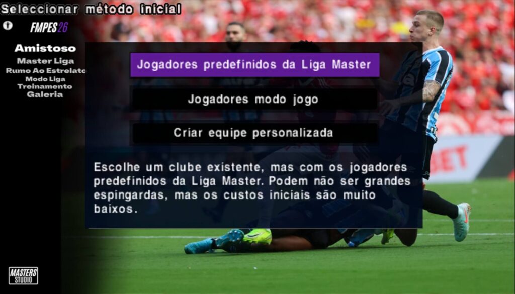 Os principais e mais jogados modos de jogo do Efootball 2026 PPSSPP, primeiro a Master League, onde você cria seu próprio time para competir nas principais competições do futebol mundial, mas também pode selecionar um time já criado, tipo o Real Madrid, e contar com todos os jogadores da Equipe.