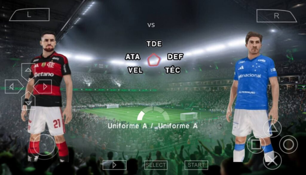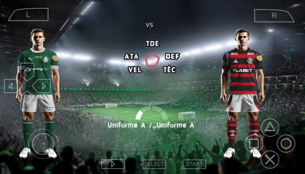 Por fim, vou falar do Modo Amistoso, no Efootball 2026 PPSSPP é incrível você poder jogar uma partida rápida com qualquer time do jogo contra a CPU, e nessa partida você pode selecionar o Estádio, Clima, Tempo de Jogo, Bola, e se quiser, pode colocar prorrogação e penaltis caso saia empate.