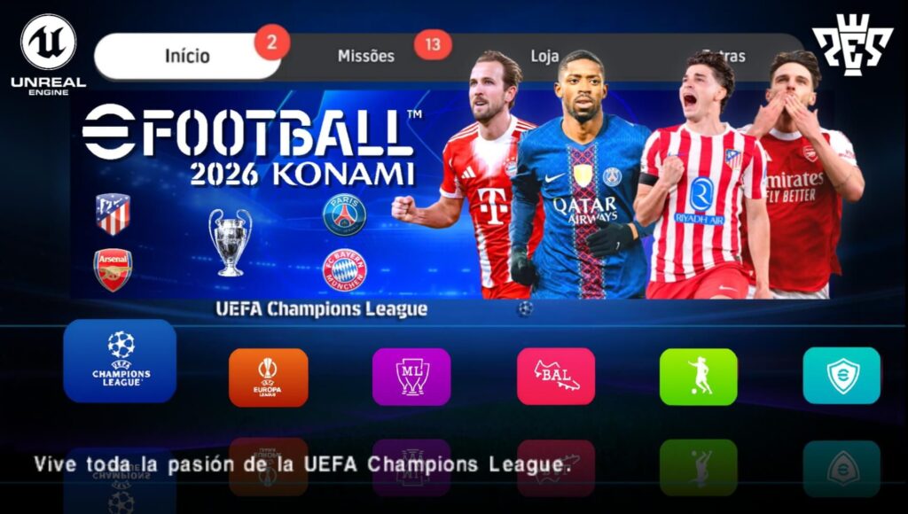 Uefa Champions League e a Conmebol Libertadores são dois modos de jogo extremamente bons no Efootball 2026 PPSSPP, você pode jogar as competições sem precisar entrar na Master League, Rumo ao Estrelato ou Jogador Mundial, apenas selecionando o time e jogando com ele até ser campeão ou ser eliminado.