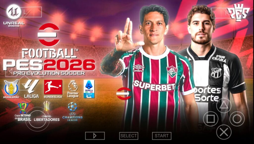 Essa é a primeira versão que eu venho lhes mostrar, Efootball Pes 2026 PPSSPP Brasileirão e Europeus. Uma versão do jogo focada no Brasileirão série A & B, onde todos os times estão atualizados com seus jogadores atuais, uniformes, e com seu estádio. Mas não para por aí, nessa versão também tem as ligas do futebol europeu, e todos os elencos também estão atualizados, com seus atuais jogadores, uniformes e estádios. Também é possível jogar a Conmebol Libertadores e a Copa do Brasil no Efootball Pes 2026 PPSSPP Brasileirão e Europeus. No futebol europeu, você pode jogar a incrível Uefa Champions League.