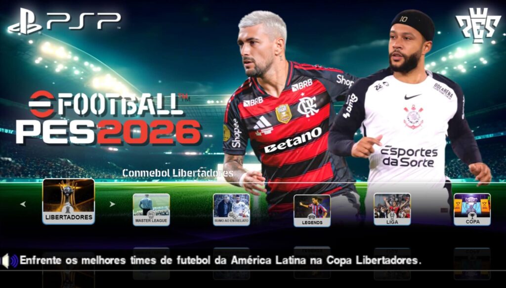 Essa é a primeira versão que eu venho lhes mostrar, Efootball Pes 2026 PPSSPP Brasileirão e Europeus. Uma versão do jogo focada no Brasileirão série A & B, onde todos os times estão atualizados com seus jogadores atuais, uniformes, e com seu estádio. Mas não para por aí, nessa versão também tem as ligas do futebol europeu, e todos os elencos também estão atualizados, com seus atuais jogadores, uniformes e estádios. Também é possível jogar a Conmebol Libertadores e a Copa do Brasil no Efootball Pes 2026 PPSSPP Brasileirão e Europeus. No futebol europeu, você pode jogar a incrível Uefa Champions League.