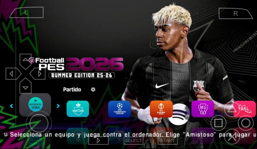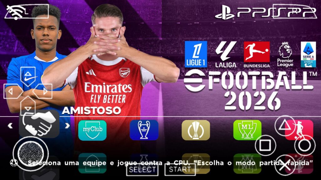 O que todas as versões do jogo tem em comum? Isso mesmo, todas elas, independente das ligas que possuem, tem os mesmos modos de jogo. No Efootball Pes 2026 PPSSPP você pode jogar primeiramente o modo amistoso, uma partida casual, pode ser normal, ou penaltis, e você pode personalizar tudo antes do jogo começar, estádio, bola, tempo de partida, prorrogação, disposição dos jogadores, clima etc. Também tem o modo legends, Master League, que é um dos modos de jogo mais jogados pelos jogadores de Efootball Pes 2026 PPSSPP, assim como o Rumo ao Estrelato, que é quase parecido com a Master League, mas você controla apenas seu jogador. Também tem o jogador mundial, ligas, copas e treinamento.