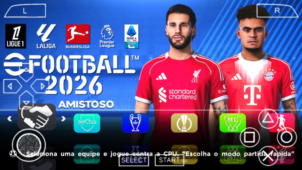 O que todas as versões do jogo tem em comum? Isso mesmo, todas elas, independente das ligas que possuem, tem os mesmos modos de jogo. No Efootball Pes 2026 PPSSPP você pode jogar primeiramente o modo amistoso, uma partida casual, pode ser normal, ou penaltis, e você pode personalizar tudo antes do jogo começar, estádio, bola, tempo de partida, prorrogação, disposição dos jogadores, clima etc. Também tem o modo legends, Master League, que é um dos modos de jogo mais jogados pelos jogadores de Efootball Pes 2026 PPSSPP, assim como o Rumo ao Estrelato, que é quase parecido com a Master League, mas você controla apenas seu jogador. Também tem o jogador mundial, ligas, copas e treinamento.