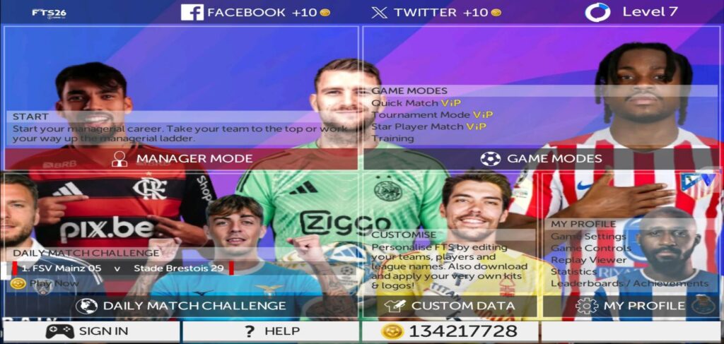 No FTS 2026, em qualquer versão você tem os melhores modos de jogo de todos os tempos em jogos de futebol. O Modo Carreira está presente em qualquer versão do FTS 2026, você seleciona um time, e tem que fazer de tudo para ser o maior campeão com ele, mas claro que não é fácil, e não estou dizendo de dificuldade nas partidas, mas em tudo, primeiro as finanças do clube, você precisa se organizar financeiramente para não quebrar o time, contratar e vender jogadores, evoluir, e lidar com lesões de jogadores importantes, o Modo Carreira no FTS 2026 é bem realista. O Rumo ao Estrelato do FTS 2026 não é tão realista como o Modo Carreira e outros jogos de futebol, porque ele não é um modo de jogo, ele apenas é uma opção de jogo, ou seja, você seleciona a partida e seleciona a opção de unico jogador, e escolhe quem será seu jogador na partida.
