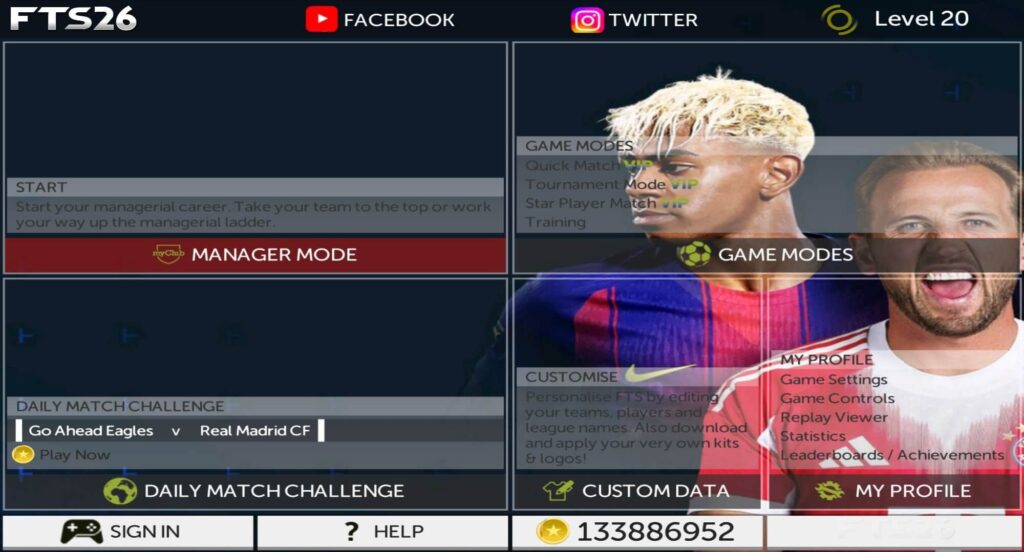 No FTS 2026, em qualquer versão você tem os melhores modos de jogo de todos os tempos em jogos de futebol. O Modo Carreira está presente em qualquer versão do FTS 2026, você seleciona um time, e tem que fazer de tudo para ser o maior campeão com ele, mas claro que não é fácil, e não estou dizendo de dificuldade nas partidas, mas em tudo, primeiro as finanças do clube, você precisa se organizar financeiramente para não quebrar o time, contratar e vender jogadores, evoluir, e lidar com lesões de jogadores importantes, o Modo Carreira no FTS 2026 é bem realista. O Rumo ao Estrelato do FTS 2026 não é tão realista como o Modo Carreira e outros jogos de futebol, porque ele não é um modo de jogo, ele apenas é uma opção de jogo, ou seja, você seleciona a partida e seleciona a opção de unico jogador, e escolhe quem será seu jogador na partida.