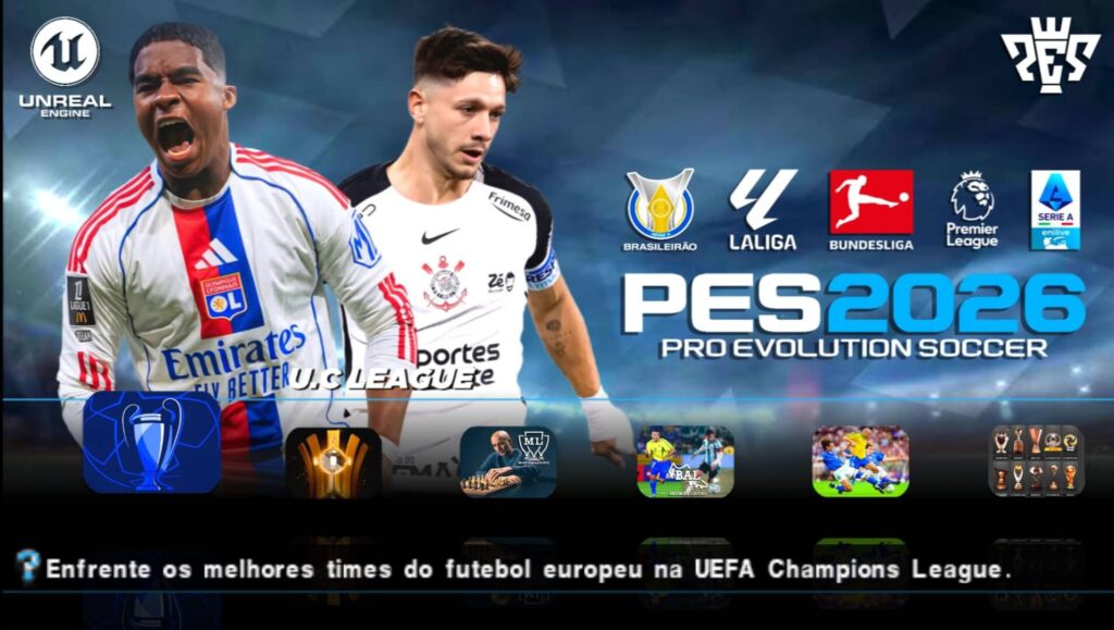 Efootball 2026 PPSSPP Brasileirão e Europeus é a mais clássica e mais jogada no Brasil, é focado no Brasileirão e times da Europa, possui a Conmebol Libertadores e a Uefa Champions League.
