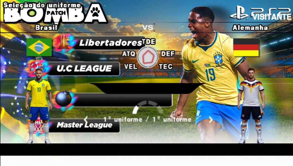 Já disse acima que a Master League é um dos melhores modos de jogo do Bomba Patch 2026 PPSSPP, e vou mostra o motivo. Na Master League você pode iniciar com um time do jogo, ou criar o seu do zero, no seu time você precisa primeiro ser um bom gestor, controlar as finanças, fazer contratações, renovar contratos e vender jogadores. Você também é o técnico, precisa arrumar seu time antes do jogo, fazer a formação do time e durante a partida boas substituições. Seu time compete a liga nacional, a copa nacional, e a copa do continente, se escolher um time brasileiro, você joga o Brasileirão, Copa do Brasil e Libertadores, talvez a Copa Sul Americana, e se ganhar a Libertadores, pode disputar o Mundial de Clubes do ano.